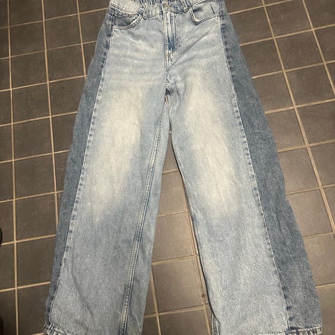 H&M leveälahkeiset farkut, malli wide, high waist. Koko 140 cm. Viisi taskua, vetskari ja nappi edessä.