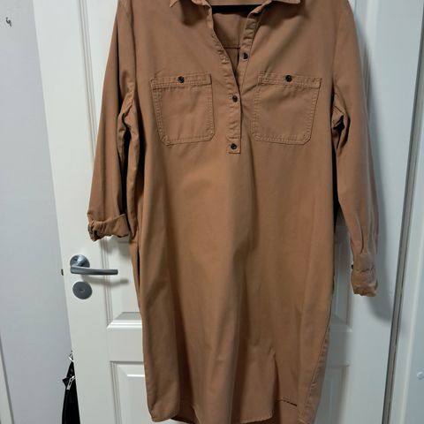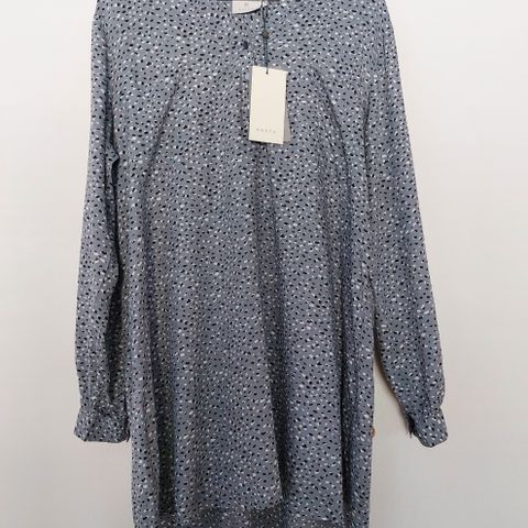 Vaaleansininen Kaffen paitamekko vyöllä ja kauniilla yksityiskohdilla.