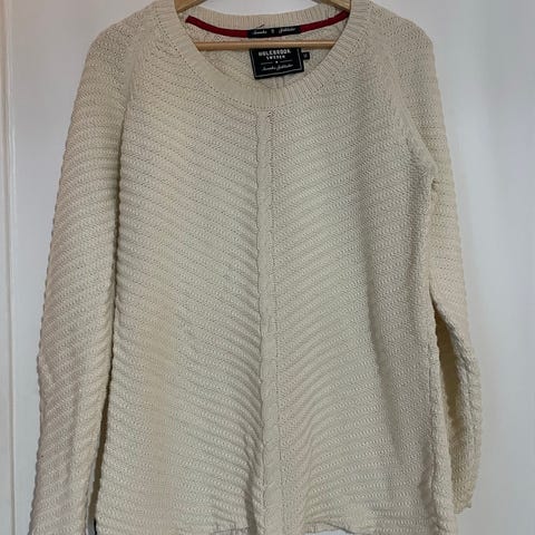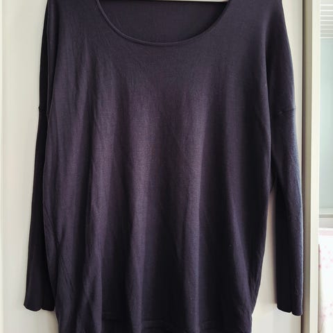 Kokomerkintä L, ja vaikka neulos tietysti joustaa, niin itse määrittelisin kuitenkin tämän enemmän M kokoiseksi. Mitat venyttämättä: kainalo-kainalo 45cm, lantion kohdalta leveys n. 48cm, pituus olka-helma 87cm.
