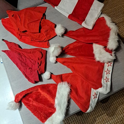 3 kpl tonttulakkeja , kaikissa pieni kulkunen . Yhteensä 5 e. Jos erikseen niin 2 e. / kpl. Kaksi lakkia on kankaisia ja vähän oranssisempi paksumpaa . ( kangas / huopa )