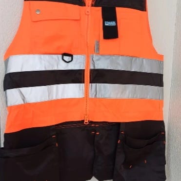 Hyvässä kunnossa oleva huomio/työliivi työmaalle mukana roikkuvat lisä taskut ja molemmat vetoketjut ehjät eli pieni säätömahdollisuus on liivissä kapemmaksi tai leveämmäksi. Miesten koko 56.