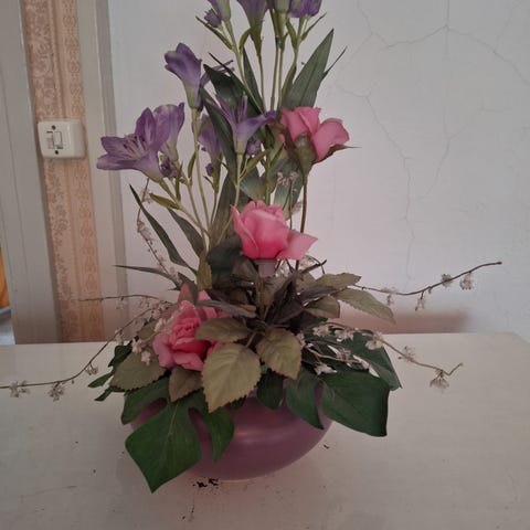 Kelluva kuppi koriste, jossa valkoisia tekokukkia ja lumimarjoja. Sopii sisustuselementiksi. Koriste on valmistettu keraamisesta kupista ja lautasesta sekä tekokukista.