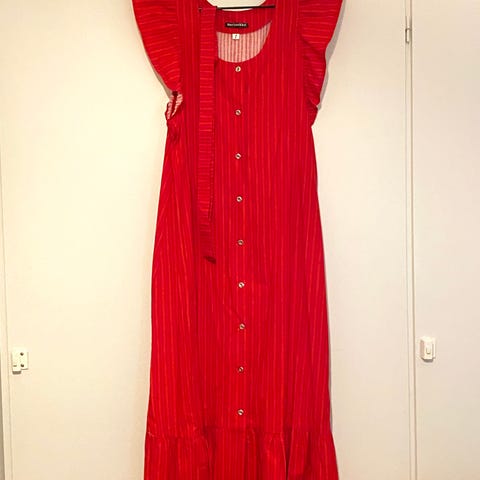 Puhvihihainen, vajaa nilkkamitta (163 cm), v muotoinen kaula-aukko.