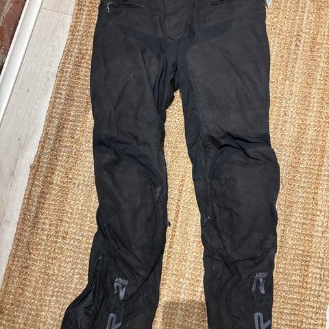 Asialliset naisten ajohousut polvisuojilla. Vedenpitävä Reissa-kalvo. Mukaan saa lämpövuoren, jonka kiinnitysvetoketju kaipaisi korjaamista. Kuvissa mittoja.