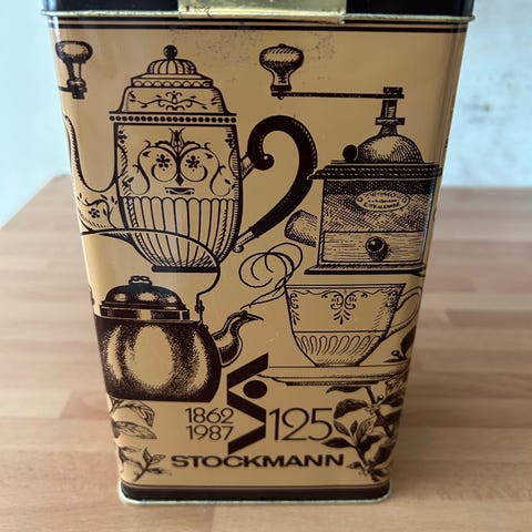 Vanha Stockmann-peltipurkki, jossa aikoinaan on ollut piparkakkuja. Tehty oletettavasti 80-luvulla Stockmannin 125-vuotis juhlaa varten.