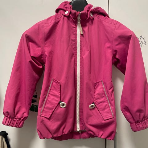 Reiman harmaa-vaaleanpunainen tuulitakki koko 116. Käytetty kunto, ei ihmeempää moitetta.