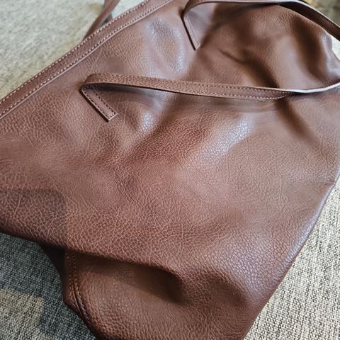 Tumman ruskea kiiltävä satiinipinta, joka puolella 😍 Ihana iso rusetti ja tasku sivulla sekä sisällä taskut, laukku noin A4 kokoinen eli täydellinen ravintolaan, juhliin tai ihan arkikäyttöön 🤗