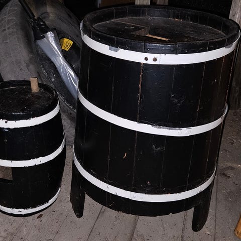 3kpl mustia peltitynnyrijakkaroita. Tynnyrit ovat kuivia ja puhtaita sisältä. Kahdessa on alareunassa kuminen reunanauha. Kolmannesta se puuttuu.