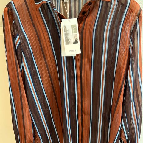 Fransa luonnonvalkoinen paita. Läpinäkyvää kangasta, keskiosassa vuori. Takana napitus. Käytetty kerran ja pesty käytön jälkeen. Koko L, mitta olalta helmaan 68 cm, leveys kainaloiden alta 57 cm.