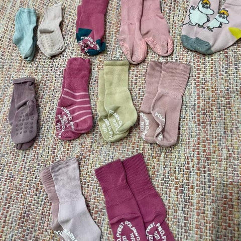 Yhdellä lapsella vähän käytettyjä vauvan sukkia.