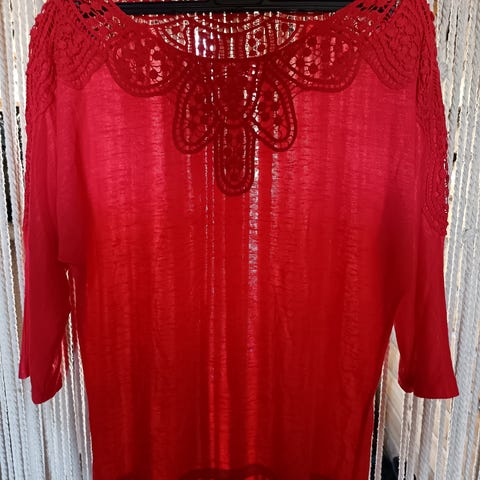 Uusi tummanpunainen paita jossa kaunis pitsihelma ja pitsiset hihansuut. Koko S-M