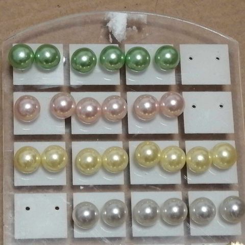 Uudet, n. 4 cm halkaisijaltaan ja kokonaiskorkeus 6 cm. Riippuvan helmen pituus 1,2 cm kaunis helmikukka punaisella kivellä koristeena ja lintu. Korut kevyet.