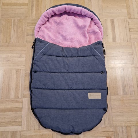 Musta kaukalopussi, ollut käytössä kahdella vauvalla. Pystyy käyttämään vaunuissa tai kaukalossa. Mukana pussi, johon menee pieneen tilaan.