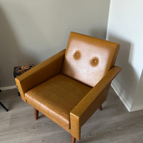 Tyylikäs ja persoonallinen vintage-nojatuoli 1960-luvulta. Verhoiltu oranssinruskealla keinonahalla.