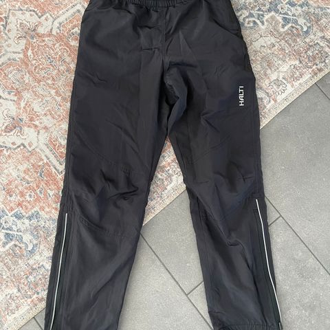 Halti hiihtohousut, 140. Henkselit ja kiristysnauha vyötäröllä. Stormwall, eli edestä tuulenpitävät ja hylkii vesipisaroita. Takaa joustavaa kangasta.