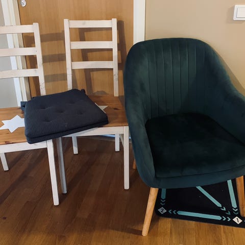 Ostettu torista noin 3kk sitten, ei kuitenkaan materiaalinsa vuoksi sovi meille kolmen kissan talouteen. Tuoli on siis samettista kangasta ja väri ruskea. Todella mukava ja pehmeä istua.