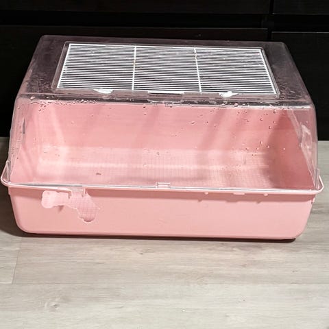 Myydään jyrsijän tai pieneläimen häkki, mukana välitaso, juoksupyörä ja pieni puutalo. Häkin alaosa on muovia, yläosa metallia. Häkin osat ovat kätevästi irrotettavia puhdistusta varten. Häkin mitat: 680 x 380 x 520 mm.