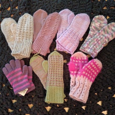Kauniit käsin neulotut pienen lapsen lapaset.