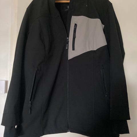 Vähän käytetty hyvä kuntoinen takki, jossa siniset vetoketjut ja korkea kaulus. Vasemmalla puolella edessä pieni tumma leijonan kuva.