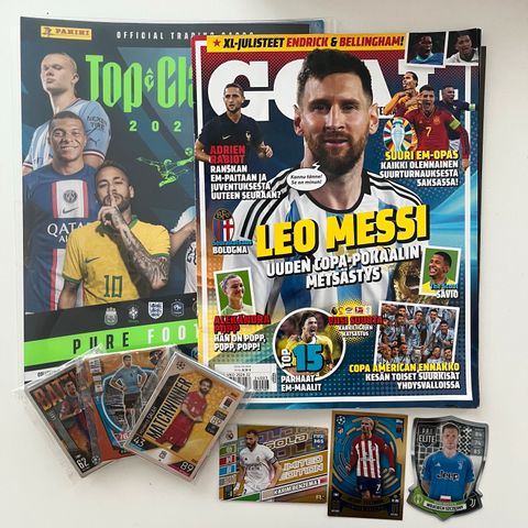 Myydään futissetti, johon kuuluu kuvassa näkyvät keräilykansio, GOAL lehti, 3 mysteeripakkaa (yhteensä 30 korttia) ja 3 harvinaista pelikorttia.