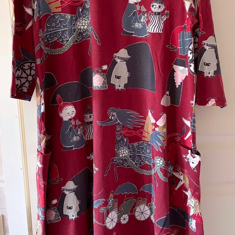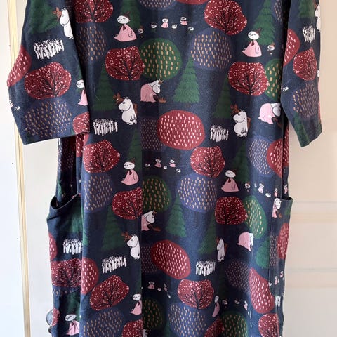 Melko harvinainen Japanin markkinoille tehty pellavainen(?) muumimekko, jonka kankaassa muumilaakson talvinen kartta. Ostettu vuosia sitten moomin charactersin samplesale:sta, mutta jäänyt käyttämättä, joten kunnoltaan erinomainen. Rinnassa pikkuruinen jälki ollut alusta asti, siitä kuva. Koko ei tiedossa, arvioisin sen olevan M (S-L). Kangas joustamatonta, mutta malli väljähkö. Hihoja kuvailisin tiukoiksi. Nouto.