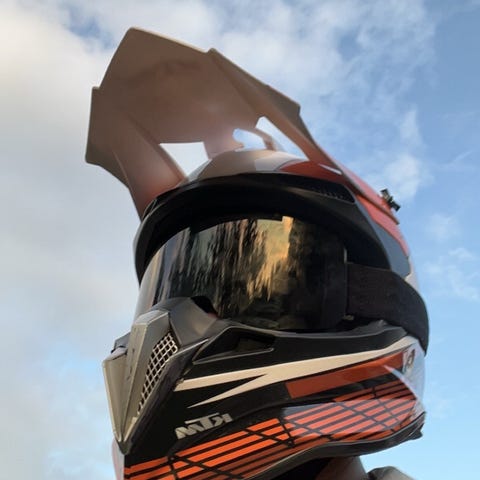 Kypärässä on avattava leuka ja kypärän saa umpinaiseksi. Yksi pala on mennyt katki, laitoin siitä kuvan. Kaikki palat tulevat pienessä suojapussissa. Mukana tulee myös action kameran kiinnitys ja kypärän suojapussi. Koko M 57-58cm