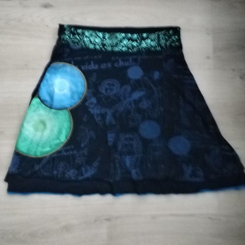 Desigual merkkinen hame. Koko S. Helmiä irronnut, mutta sitä ei juurikaan huomaa. Muuten hyväkuntoinen. Vyötäröllä leveä kuminauha.