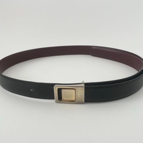 Classic and elegant black leather belt with a shiny gold buckle.