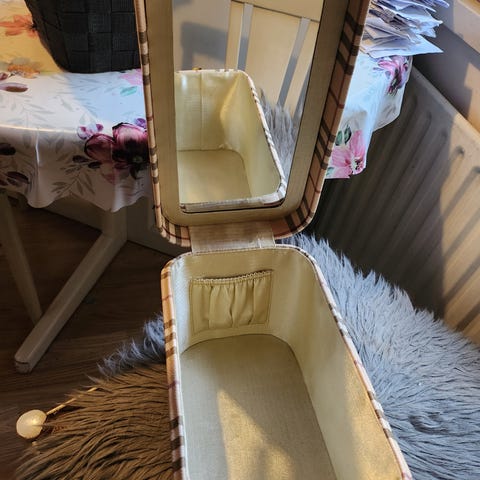 Itselle tarpeeton, tyylikäs ja uusi meikki laukku, keinonahkaa. Otettu vain kuvia, ei ole ollut käytössä laisinkaan. Monenlaiset meikit, meikkisiveltimet ja purkit mahtuvat hyvin laukkuun. Sivuilla pystytaskut molemmin puolin ja keskellä vetoketjullinen tasku, jonne saa esim pinnit säilöön.