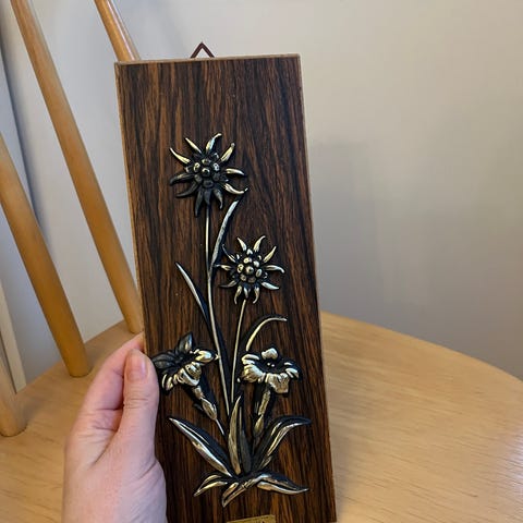 Puuta, luultavasti 70-luvulta. Tekstin yllä pieni kolhu mutta muuten hyvässä kunnossa. Halkaisija 28cm
