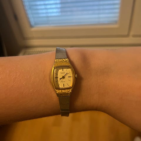 Ehjä kullattu kello. Löysin tämän luontopolulta sonkajärveltä ja huilasi löytötavaratoimistossa muutaman kuukauden. Palautui minulle ja joutaa nyt jollekkin joka sitä enemmän tarvitsee. Kellon takana kaiverrus, jossa miehen etunimi ja päivämäärä 1996 vuodelta eli lienee lahjaksi saatu.