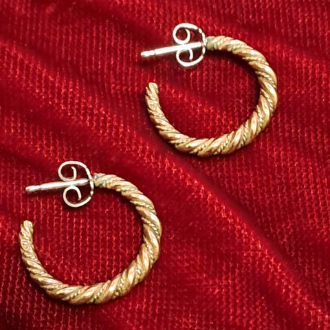 Uudenveroiset pronssiset, koukkuineen 4cm pituiset spiraalikuvioiset korvakorut, joissa koukkuvaihtoehdot 1 tai 2