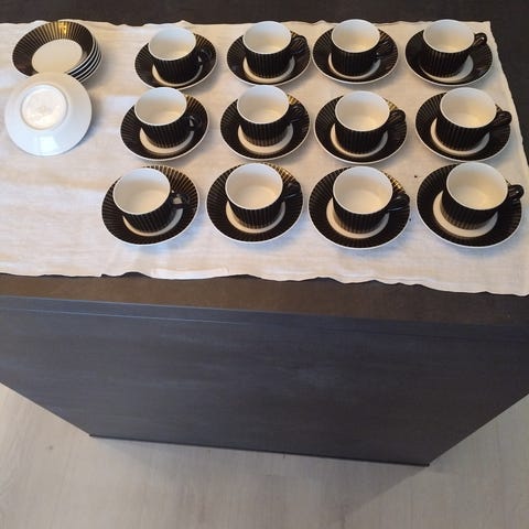 Astiastossa 7 pientä kahvikuppia sekä lautaset.