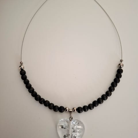 Aarikan kaulaketju, jossa sydämiä. Lukossa hieman tummentumaa, mikä ei näy käytössä.