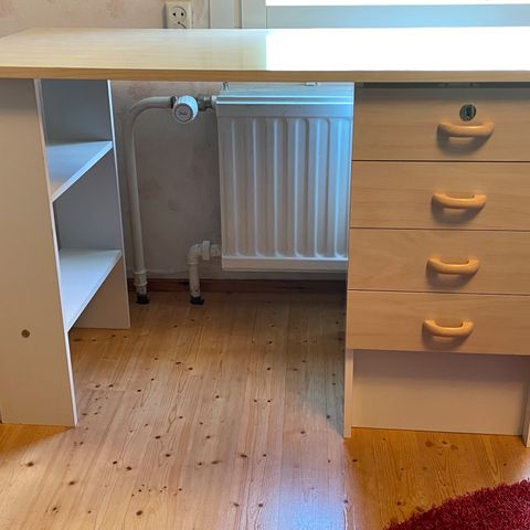 Punaisen väriseksi entisöity vanha kirjoituspöytä/senkki.