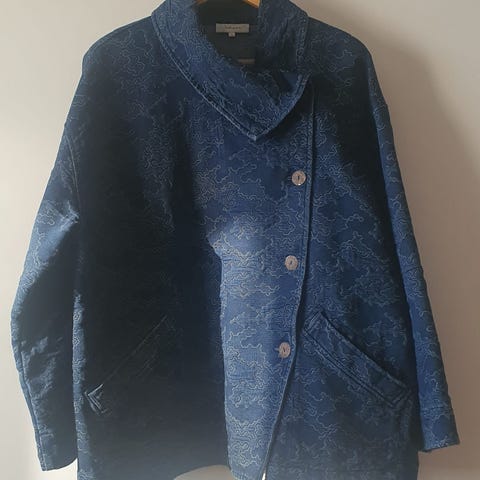 Siisti tummansininen bleiseri/jakku. 100 % puuvillaa. Takki valmistettu Tukholmassa. Taskut edessä. Merkki: Jascha Stockholm.
