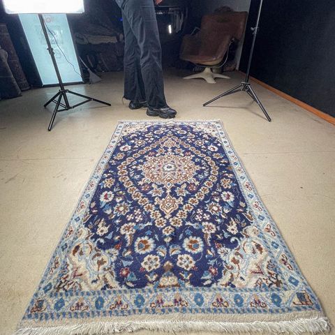 Tyrmäävä ja poikkeuksellisen yksityiskohtainen perinteinen iranilainen Nain-villamatto kukkaisteemalla. Kaunis harvinainen sinivaalea väritys silkkidetaljeilla. Upea keskimedaljonki.