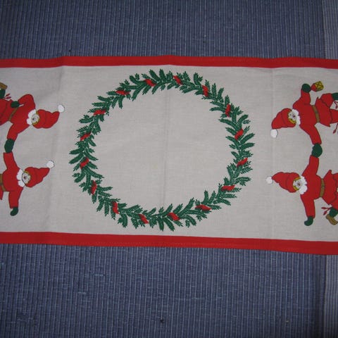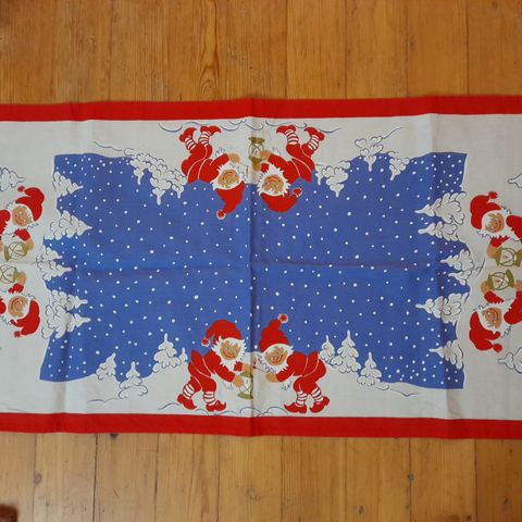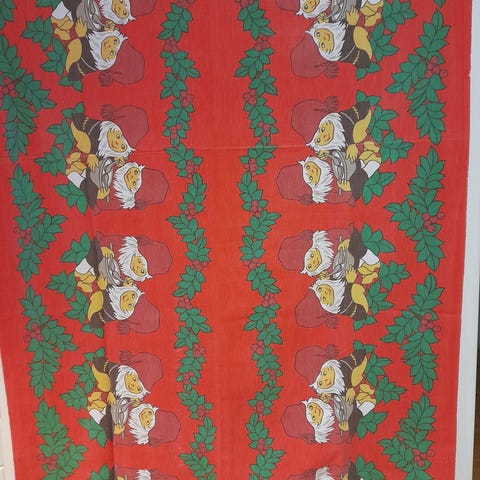Hyväkuntoinen, paikoin punaisessa värissä lievää vaaleaa pesuraitaa. Koko 130 x 150cm. Puuvillaa.