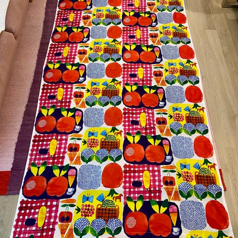 Marimekko Marimekkoa Marimekon suomalainen design skandinaavinen verho kangasverho täyspitkä klassikko puuvillaverho Sonja kasvikuosi jouluverho