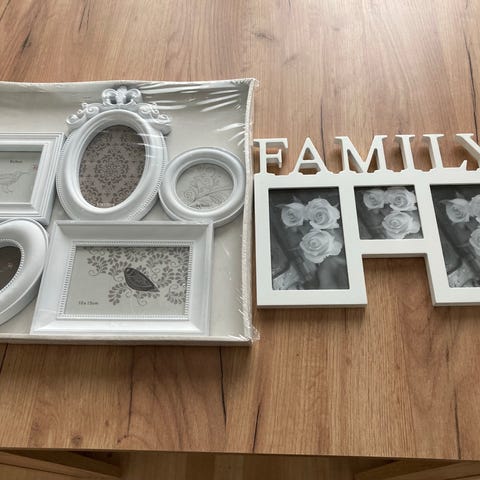 Neljä kappaletta valkoisia valokuvakehyksiä. Ostettu mielestäni aikanaan Ikeasta, mutta täyttä varmuutta ei ole. Korkeus ja leveys 25,5cm ja siihen mahtuu joko 23x23cm kuva ilman kehyskartonkia tai 12x12cm kuva kehyskartongin kanssa.