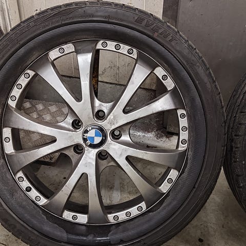 E70 alta 22x10" vanteet, suorat ja hitsaamattomat. Pölyiset kuvassa, kevyesti kanttaroitu osaa mutta melko siistissä kunnossa. Kesärenkaat on lähinnä loppu.