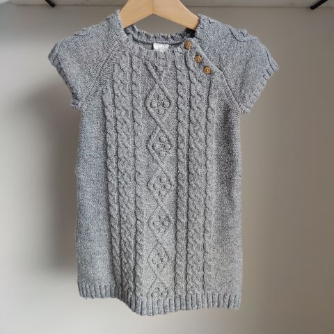 Puuvillainen neulemekko, takana niskassa napit, olkapäillä neulefrillaa. Koko 86 cm. Siisti kunto.
