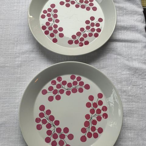 Arabia Kilta Marjat vintage lautaset 2x. Suunnittelija Kaj Franck. Sarja 1952 ->, nämä vuosimallia 1967. Ajatonta astiastoa koristaa sininen Marjat-kuvio, jossa nähdään herkullisia ryppäitä marjoista. Käytetty ja käyttöön sopivat täysin. Ei tietenkään uusia ole, ajanmukaisia. Kuvattu laajasti ja kattavasti, katso kuvat tarkkaan. Pieniä puutteita lasitteessa ja sinisessä. Hyvin kauniit edelleen.