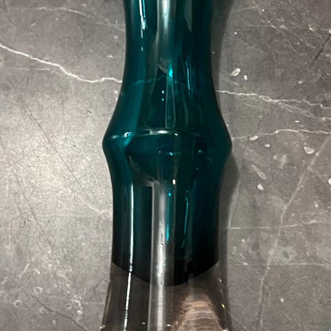 Riihimäen lasin siniharmaa maljakko. Tamara Aladin suunnittelema, malli nro 1377