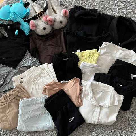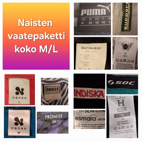 Pakettiin kuuluu eri merkkisiä t-paitoja, hupparia sekä collegepaita, perus arkivaatetta ja ehjiä. Mukana mm. BikBok, FSBN ja 157.