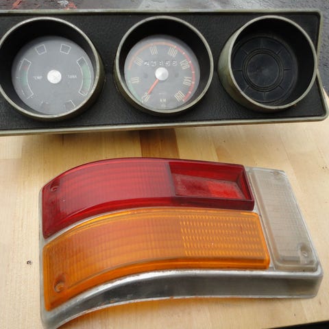 Opel Kadett B nopeusmittari ja lämpö/bensa -mittarien taulu.