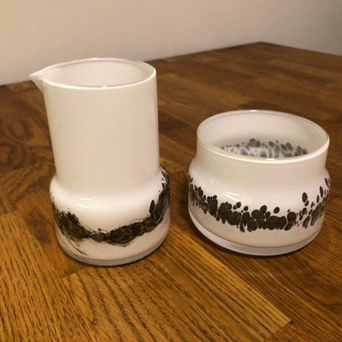 Myynnissä upea retropari – Nuutajärven lasitehtaan Apila-sarjan kermakko ja sokerikko, suunnittelijana legendaarinen Oiva Toikka.