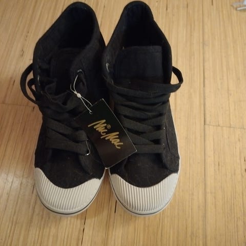 Mustat nauhalliset kangastennarit, joissa kapea lesti.