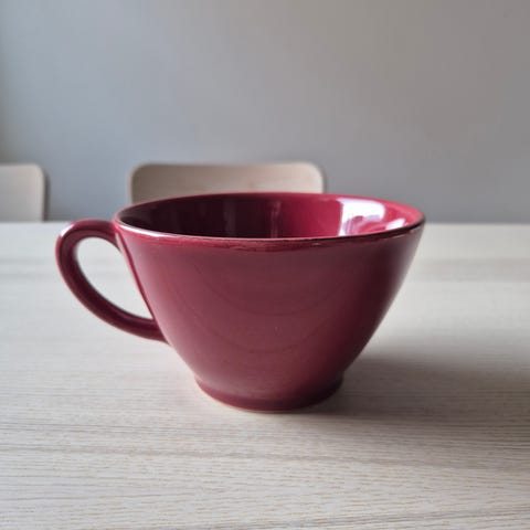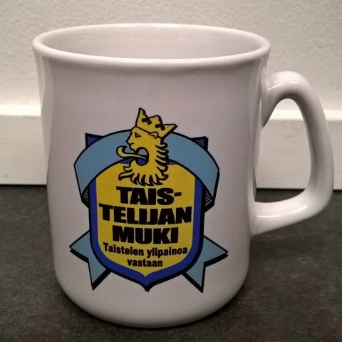 Oikein siisti jättimuki. Ostettiin sillä ajatuksella että ei tarvitse heti kaataa uutta kuppia, kun kokoa on normaalia enemmän. Jos mitoitus tärkeä, kysy nii mittaan tarkemmin.