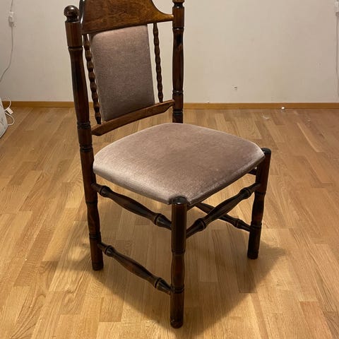 Erittäin siistit tuolit, sopiva istuinkorkeus, ruskea massiivipuu + sametti verhoilu